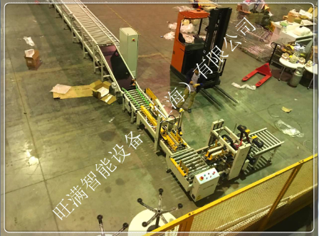 本包裝生產流水線主要操作流程:已裝好產品折好上蓋的產品箱從左邊的滾筒進入此流水線,進入第一臺包裝機械:全自動一字型封箱機(進行一字型封箱)—→進入第二臺包裝機械:全自動打包機(打兩道打包帶)—→進入第三臺包裝機械:90°旋轉機—→進入第四臺包裝機械:全自動角邊封箱機(進入四角邊封箱,形成工字型封箱)—→進入后第五臺包裝機械:全自動打包機(打另外兩道的打包帶,形成井字形打包)—→工字型封箱+井字型打包完成。