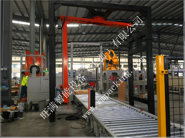 托盤供應(yīng)+機(jī)器人碼垛+穿劍打包+在線纏繞流水線(棧板輸送、機(jī)器人堆垛、在線打包、懸臂纏膜流水線)
